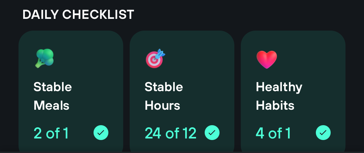 The Levels app design is intuitive. A quick look at the home screen and you'll know what the goals are for the day and how you're doing. The app sets three daily goals: 12 hours of glucose stability, one stable meal, and one healthy habit, which includes varying exercise levels and sleep quality.