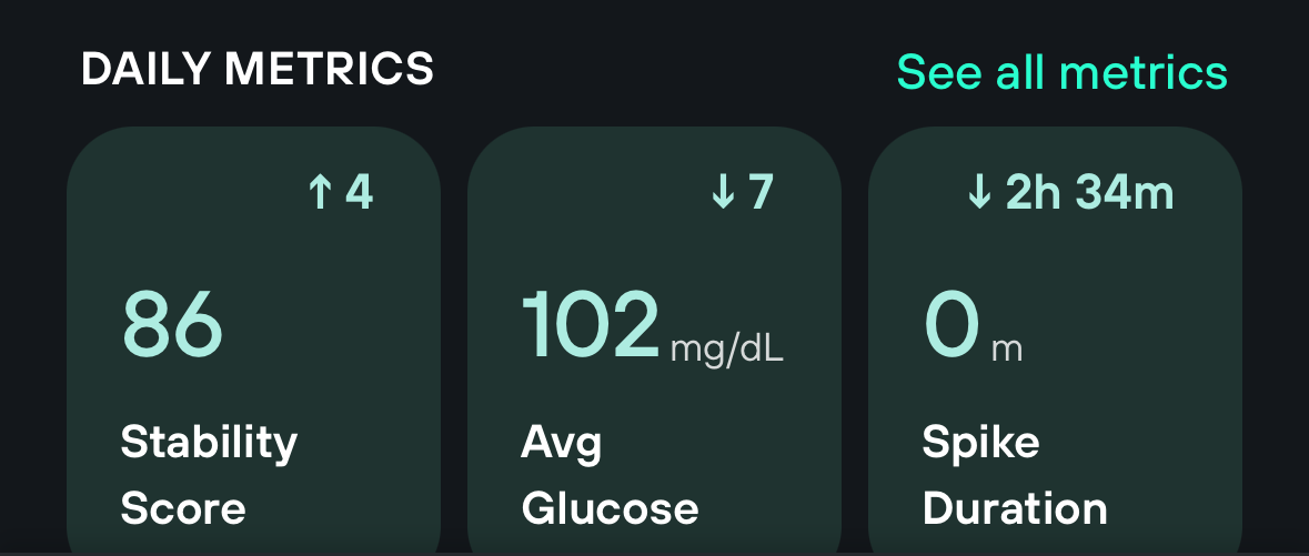 The home screen shows your average glucose, stability score, and spike duration. The goal is to keep your stability score above 85. Basically, you want to avoid spikes, which are any time your glucose rises at least 30 mg/dL and exceeds 110 mg/dL. Exercise-related spikes don't count against you if you log them or import from a device like an Apple Watch.