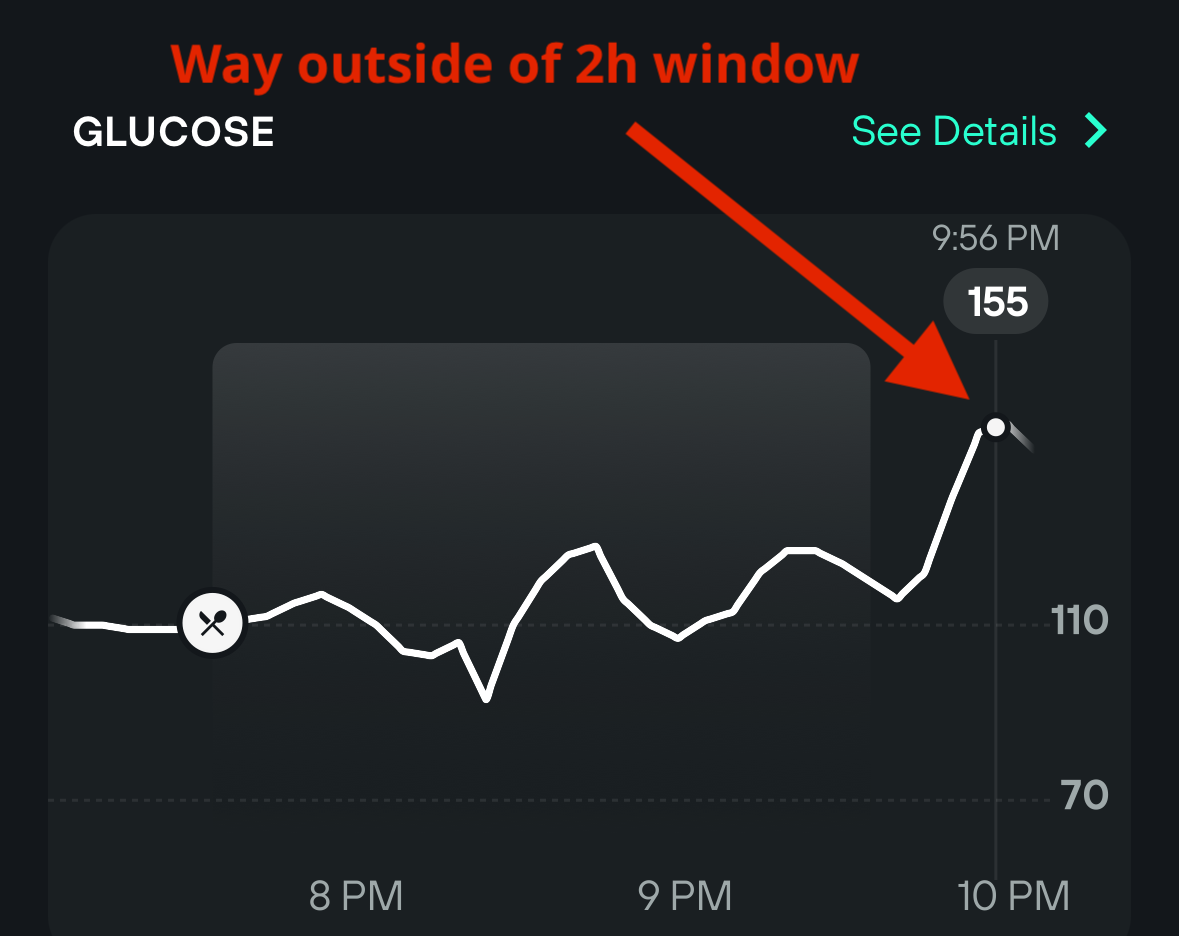 The annoying part of meal scoring is the two-hour window. My levels would often spike around 2.5 to 3 hours after eating with no other changes, which meant my scores looked better than they should have been. I'm not alone either. The top requested feature on the Levels community page is adjustable meal score windows, which seems like a no-brainer.